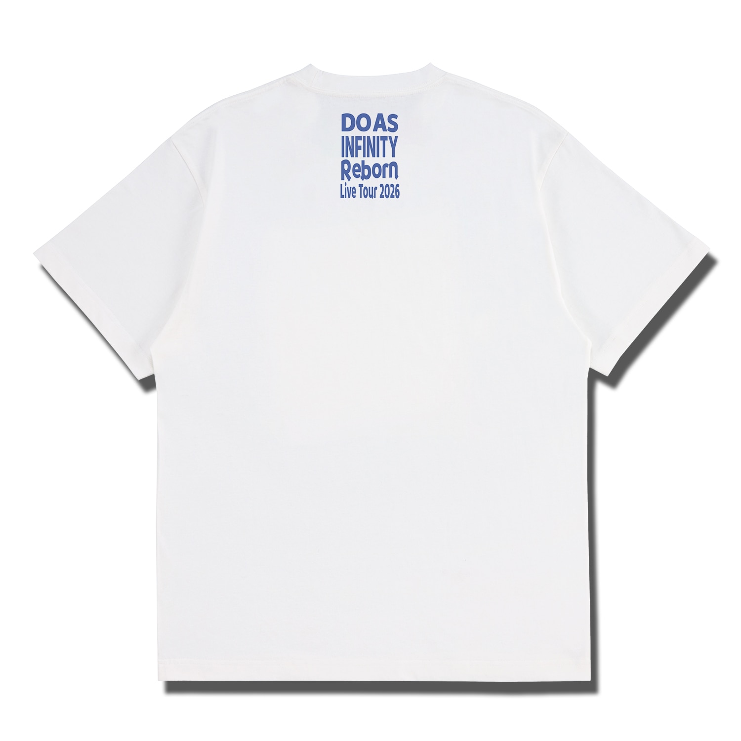 2026年1月リリースのアルバム「Reborn」全楽曲名をデザインしたホワイトTシャツ!ポップで躍動感のあるタイポグラフィが魅力の一枚。ライブ会場で映えること間違いなし!